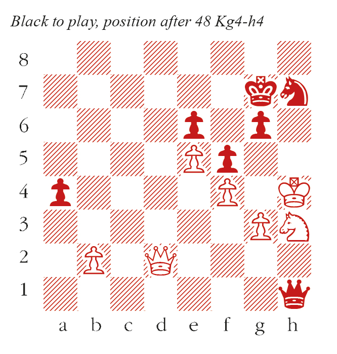 48…Qf3? 48…g5+! 49 fxg5 Nf8 threatens Nf8-g6+ and prevents Qd7+. The finish could be 50 g6 Qf3 51 Nf2 Nxg6+ 52 Kh3 f4 53 Qd7+ Kh6 54 Ng4+ Qxg4+! 55 Kxg4 Nxe5+ 56 Kxf4 Nxd7 and wins. 49 Qd7+ Evidently, MVL had intended 49…Kh6 but 50 Qxh7+! Kxh7 51 Ng5+ turns the tables. Kf8 50 Qd8+ Kf7 51 Qd7+ 51 Ng5+ Nxg5 52 Qd7+ Kg8 53 Kxg5 Qxg3+ 54 Kf6 wins, but a draw was all Caruana needed for match victory. Kf8 52 Qd8+ Kf7 53 Qd7+ Kf8 54 Qd8+ Draw agreed