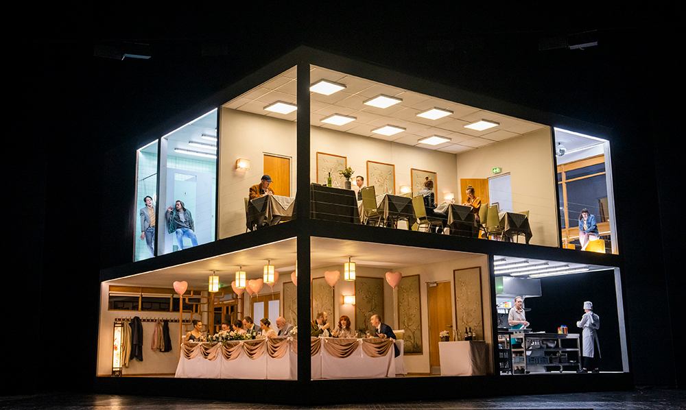 So Innocence was never likely to pull its punches. Chloe Lamford’s set – a brightly lit modernist structure that revolves as the plot moves between present and (traumatic) past – is simultaneously bold and simple. It needs to be, because in telling a story spread across a decade from the perspectives of some 13 distinctly drawn characters, Saariaho and her librettist have set themselves a formidable challenge. On first viewing, I’d say they’ve pulled it off, and with compelling power. We’re at a wedding reception in contemporary Finland: inevitably, you think Festen; you think Melancholia. You know that something monstrous is going to surface, and Innocence explores that something with terrible, tender, unflinching care. So careful, in fact, are Saariaho and Oksanen to probe the full complexity of the story – to allow every character their humanity and their due share of innocence and culpability – that it’s almost painful to experience. Innocence is scar tissue being probed until the blood starts to seep; a series of elastoplasts being pulled off very slowly indeed. And yet – this being Saariaho – it sounds utterly beguiling: easing you in, lulling you with its shimmering melancholy and shifting colours, until suddenly the horror is real and you realise that you’re being propelled forwards at a frightening pace.