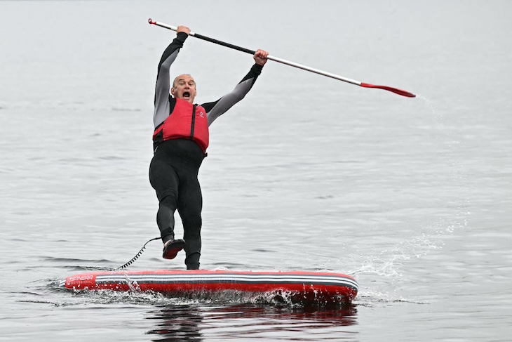 On Tuesday, he was pictured repeatedly falling from a paddleboard on Windermere in Cumbria – a stunt to highlight the issue of sewage dumping, apparently. On Wednesday, he was on a bike, peddling down a steep hill, ostensibly en route to the party’s Welsh campaign launch. ‘Having a wheelie great time,’ he tweeted.
