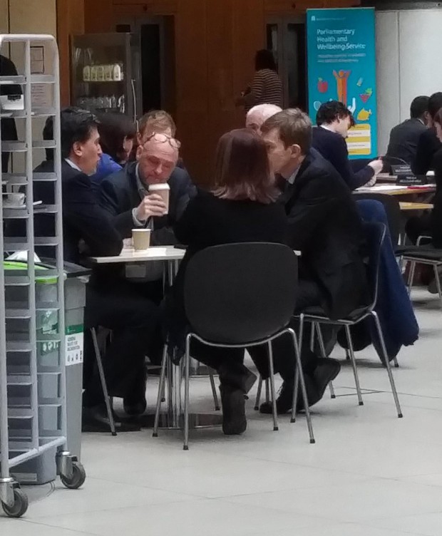 Miliband was spotted engrossed in conversation this lunchtime with Team Corbyn. A beady-eyed spectator snapped a photo of Ed having a coffee with Seumas Milne — Corbyn’s director of comms — and Kevin Slocombe — head of Leader’s media — in Portcullis House.