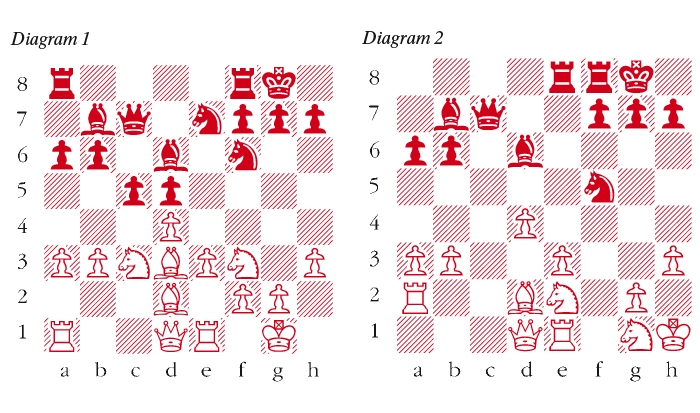 1 d4 e6 2 c4 d5 3 e3 c5 4 Nc3 Nf6 5 Nf3 Nc6 6 Bd3 a6 7 0-0 Bd6 8 a3 b6 Staunton employs the fianchetto – an idea with which the Frenchman was clearly unfamiliar. 9 Re1 0-0 10 h3 White seems to be at loss for a plan. 10 … Qc7 11 b3 Ne7 Preparing … Bb7 to take control of e4. 12 Bd2 This is very feeble. 12 Bb2 was more to the point. 12 … Bb7 13 cxd5 exd5 (see diagram 1) Black can now look forward to eventual occupation of e4. 14 Kh1 White is drifting. This weak move deprives the e-pawn of protection. 14 … Rae8 Staunton masses his forces to bring them into contact with the e4-square. 15 Ra2 After this artificial move, White’s game crumples. 15 … Ne4 16 Bxe4 dxe4 17 Ng1 cxd4 18 exd4 Nf5 The black forces burst into life. 19 Nce2 e3 20 fxe3 (see diagram 2) 20 … Rxe3! The rook is immune. If 21 Bxe3 Nxe3 threatens mate and the queen. 21 Qc1 Qxc1 There is nothing wrong with this but 21 … Bxg2+ 22 Kxg2 Qb7+ 23 Kf1 Rfe8 was winning immediately. 22 Rxc1 Rxb3 23 Rc3 Rxc3 24 Bxc3 Nh4 Black has an overwhelming position in the endgame. 25 Nf3 Nxf3 26 gxf3 Bxf3+ 27 Kg1 Re8 28 Kf2 Bxe2 29 Rxe2 Rxe2+ 30 Kxe2 Bxa3 31 Kd3 f6 32 Ke4 b5 33 Kd5 b4 White resigns