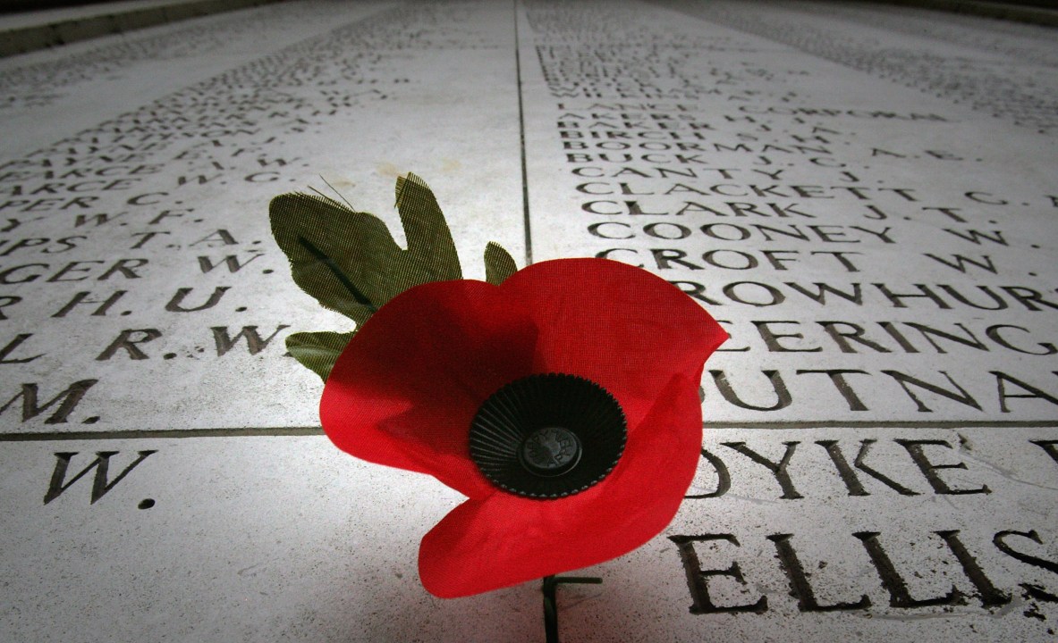 A poppy rests on a memorial for the fallen and missing of World War I, in Ypres, Belgium. Today, thousands of remembrance services will take place across Britain, ahead of the 90th Anniversary of the armistice on Tuesday.