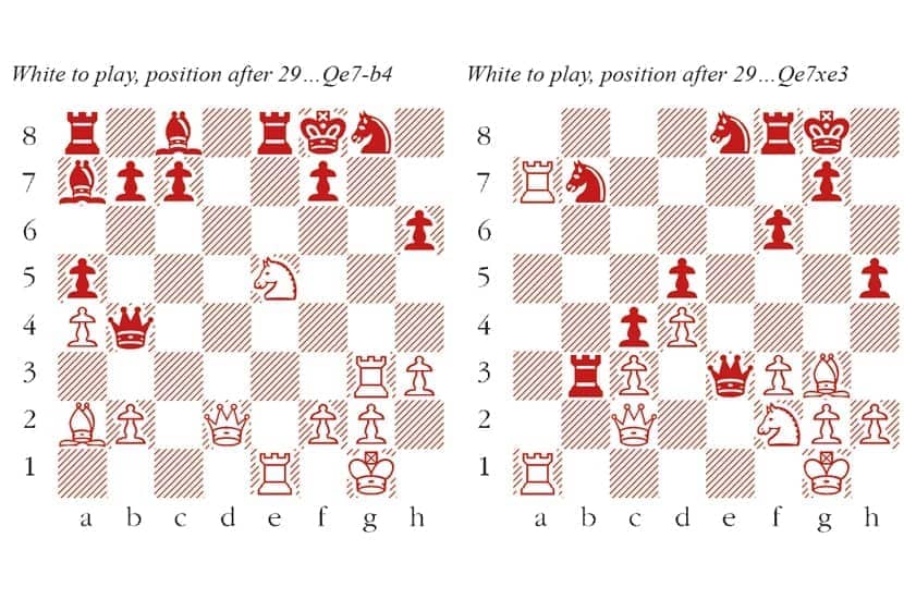 30 Qf5! Rxc3 30…Rb5 31 Qd7! is acutely embarrassing. 31 Qxd5+ Rf7 32 h4 Not 32 Rxb7? Rc1+ Qe7 33 Ne4 Rb3 34 Nc5 Rb2 35 Re1 Winning material, so Black resigns.