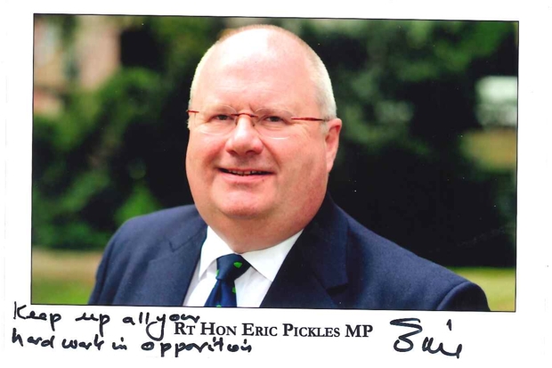 This latest letter that I have been passed, however, takes the metaphorical biscuit. After a story appeared in the Sun on Sunday about glamorous Russian fans demanding photos of Eric Pickles, it seems his Labour shadow Hilary Benn saw a chance to make some mischief, by requesting a photo. Pickles’ deputy Brandon Lewis returned fire: