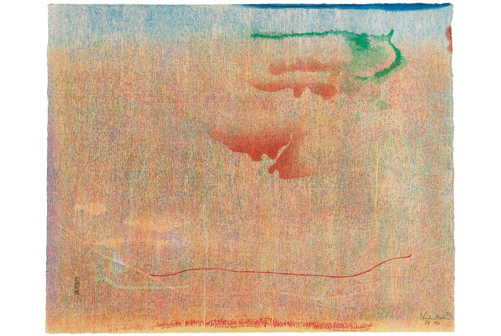 Of all printmaking techniques, woodcut might have seemed the least conducive to Frankenthaler’s ambiguous, non-linear image-making. ‘Doing a fluid shape out of wood is so foreign to me,’ she admitted. For her first attempt, ‘East and Beyond’ (1973), with Russian-American printmaker Tatyana Grosman she cut out around the forms with a jigsaw. It was with master printmaker Kenneth Tyler that she hit a groove. Like all innovators Frankenthaler was constantly nagged by the question ‘What if?’ and Tyler let her — as inventive as she was —find answers. He stood by while she scarified the paper surface with power sanders and cheese scrapers, or applied paper pulp with a turkey baster and a comb. She called this roughing-up process ‘guzzying’.