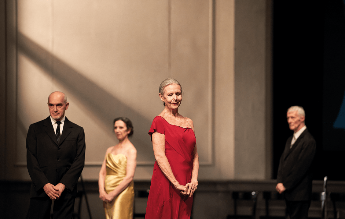 Half a century on, Tankard has assembled nine of Kontakthof’s first cast (including herself) and persuaded them to re-enact what they can in counterpoint to the 1978 film, projected on to either a translucent scrim in front of them or a screen behind them.