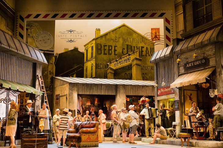 Not here. André Barbe & Renaud Doucet’s new production for Scottish Opera opens in modern Paris, with no Puccini to be heard. Tourists snap photos, an accordion player busks on a street corner and a woman pokes about in an antique shop. It’s basically Amélie. Finally, faintly, we hear the crackle of a 78 on a wind-up gramophone, playing Puccini’s opening bars. The orchestra drifts in shortly afterwards, by which time the woman (who turns out to be Mimì) is lost in a vintage reverie that happens to share the plot of La bohème. The rest of Act One is played out on a collection of secondhand furniture in the middle of the street. It’s cleverly done. And it’s nothing but an unnecessary distraction from the story that Puccini set out to tell.