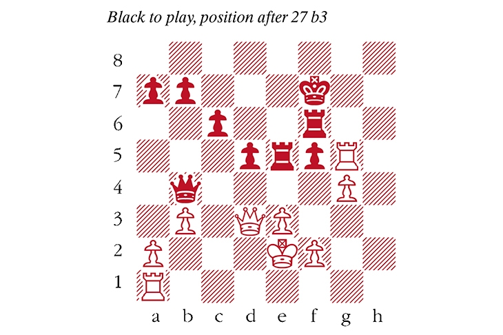1 d4 Nf6 2 Nf3 d5 3 c4 e6 4 Nc3 Bb4 5 cxd5 exd5 6 Bg5 O-O 7 e3 h6 8 Bh4 Bf5 9 Qb3 Bxc3+ 10 Qxc3 g5 11 Bg3 Ne4 12 Qa3 Nc6 13 Bb5 Ne7 14 Nd2 c6 15 Bd3 Nxd2 16 Kxd2 Bxd3 17 Qxd3 Qa5+ 18 Ke2 f5 19 Bd6 Rae8 20 g4 Rf6 21 Be5 Ng6! Very neat, as 22 Bxf6 Nf4+ wins the queen. 22 h4 Nxe5 23 dxe5 Rxe5 24 hxg5 hxg5 25 Rh5 Qb4 26 Rxg5+ Kf7 27 b3 (see diagram) Qf4!! Beautifully tricky. The Rg5 is in serious danger, and would be lost after 28 Rxf5 Qxg4+. Instead, there is just one defence, 28 Qc3, which counterattacks the rook on e5, a move which was spotted instantly by Firouzja. After 28…Qxg5 29 Qxe5 Qxg4+ the position remains unclear. 28 Qxf5 A very clever try, but it falls short. After any capture on f5, White keeps material equality, but instead. 28…Qxg5! and White is just a rook down. 29 Qxg5 Rxg5 30 Rg1 Rg8 31 f4 Re6 32 Kd3 Rge8 33 Rg3 Re4 34 Rh3 Kg7 35 g5 d4 36 exd4 Rxf4 A rook to the good, Black won thirty moves later.
