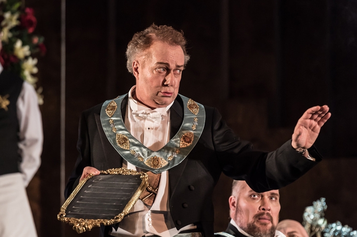 Act One takes place in a London club, not a church as Wagner mistakenly thought. So the opening chorale is a chorus practising, with Hans Sachs — who Wagner scheduled to make his entry half an hour later — monitoring events at the front. The contrast between the sacred atmosphere of the church and the urgency of Walther’s passion for Eva is thus removed. Holten, shocked that women aren’t allowed in some London clubs, has them entering with their husbands the Masters, but then having to leave. All the while there are irrelevant little things going on and distracting from what is anyway a fairly complex storyline, and this fussiness gets ever more pervasive as the opera progresses. The club setting is so elaborate that it has to make do for Act Two as well — which Wagner set in the street between Sachs’s and Pogner’s houses — with no atmosphere at all. The famous elder tree is replaced by a couple of potted plants, and the complicated arrangements with Magdalene at the window mean there is nowhere for the lovers to hide. Enter Beckmesser with his lute, except that he doesn’t have one, but a clavichord is at hand, which he plays. It turns up again conveniently for his attempted prize song in Act Three. It’s hard to tell whether the devastating riot with which the act ends takes place or is a figment of Sachs’s imagination. But anyway it isn’t a riot, just lots of people crowding the stage, and failing to disappear in an instant — one of Wagner’s most brilliant but apparently, for Holten, superfluous inspirations — when the cloven-hoofed Night Watchman appears.