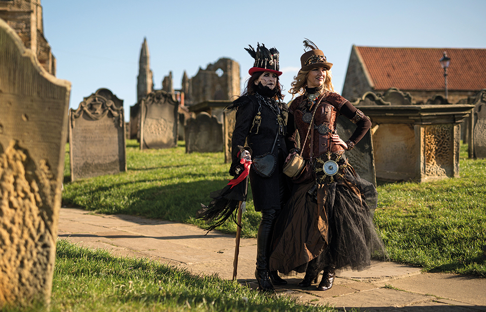 When I finally got to Whitby, I was met by thousands of people in costumes. Even the dogs were taking part. Some were wearing wings covered in silver cobwebs, others had orange witches’ hats. One was dressed as a bat. As for the people, they wore top hats with feathers and goggles, clown suits or costumes of Jack Skellington from The Nightmare Before Christmas. The most impressive outfit was worn by a university lecturer I met. He had a brown leather cowboy suit with cogwheels, pistons and pipes attached, and a mask covering his mouth. It gave him a sinister air. He also had an ammunition belt and what looked like a trumpet-gun attached to it. ‘This is a blunderbuss made from a trumpet,’ he said. ‘It took seven months to create. It’s all made of scrap.’ His look was classic steampunk, which is Victorian-inspired science fiction. ‘Steam was once the ruler and British engineering was a world leader,’ he told me.