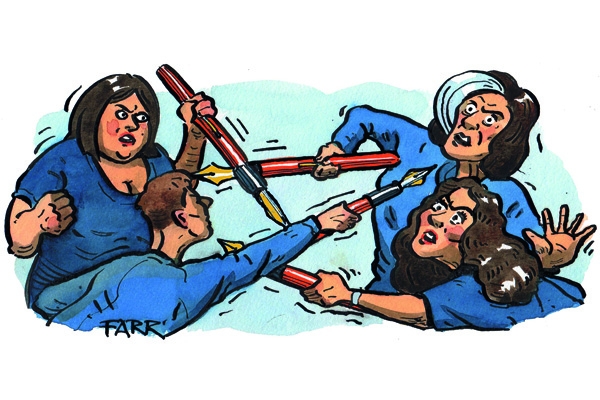 Feminists love to fight, because many of us are writers, neurotics, professional screamers and builders of straw men. Good columns are rarely fair; I doubt Naomi Wolf daydreams she is our leader, as Janice Turner wrote, and I doubt Wolf ‘won’t be able to rest easy until all of womankind has heard her gospel and has started having sex that is not just pleasurable, but worthwhile’, as Zoe Heller wrote, with a murderous italic, in the New York Review of Books. But oblivious malice, it seems, is the way we debate. Laurie Penny once wrote she wanted to slap me with a wet fish because we disagree about the inherent health of prostitution as a career choice, even though I made her risotto, and it was delicious.