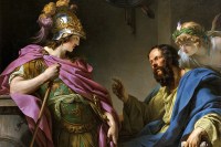 Socrates expounds on love as a means towards the universal idea (or form) of love, and thus to transcendence, which he tells the dinner companions he learned from a woman called Diotima. D’Angour has written a book about Socrates’s relationship with Aspasia, a highly educated lady who lived with Pericles, and he highlights her contribution to the philosopher’s metaphysical thinking. (Diotima means ‘honoured by Zeus’. Zeus was a nickname given to Pericles. D’Angour argues that it’s code for Aspasia.) Alcibiades touchingly ends the work by informing us (hilariously) that Socrates refused his sexual advances, despite Alcibiades’s gorgeousness. Thus the philosopher himself provides an exemplum of pure, unconditional love.