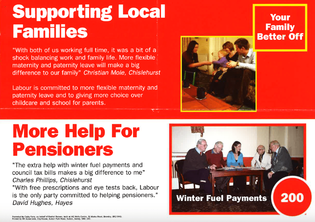 A recently-unearthed leaflet from the University of Bristol archives reveals that Rachel Reeves made winter fuel payments central to her very first election campaign. Reeves stood for Bromley and Chislehurst in 2005 and made ‘More Help for Pensioners’ one of her key priorities to voters in the Tory safe seat. It quoted one local resident claiming how ‘extra help with winter fuel payments and council tax bills makes a big difference to me.’