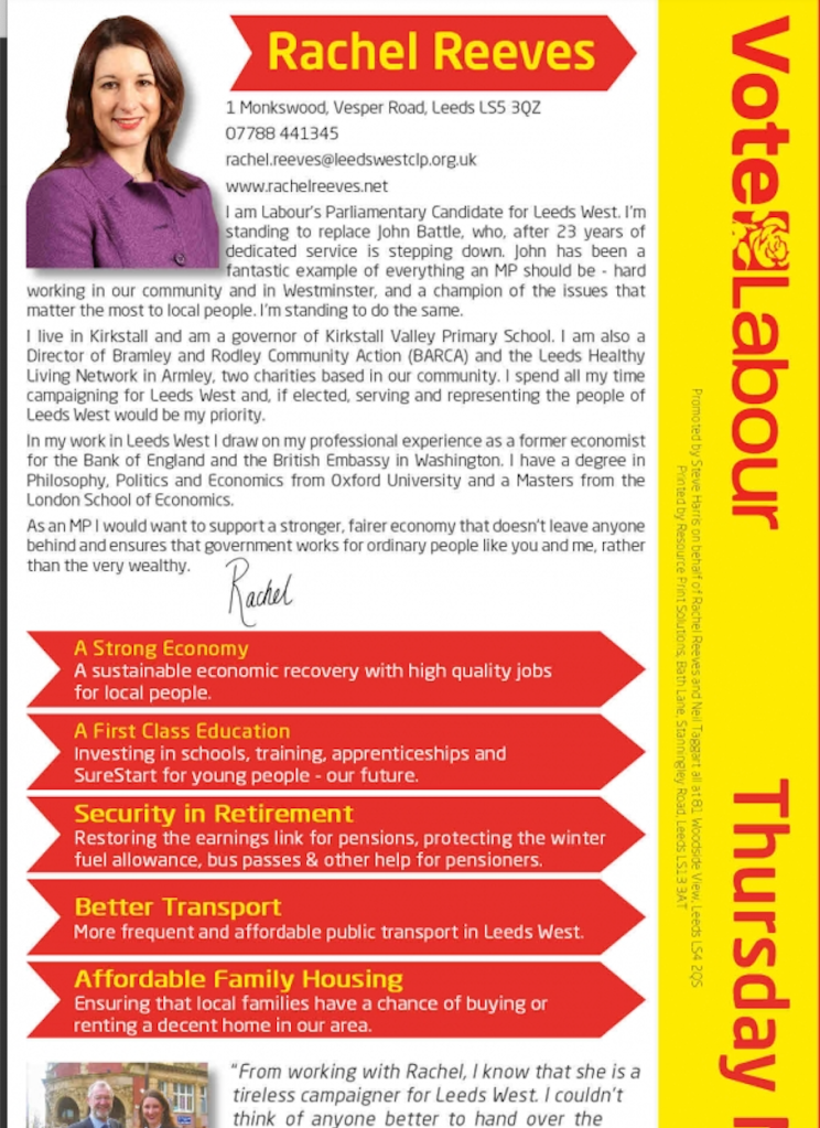 Having lost in 2005 – and then again in the 2006 by-election – Reeves then moved up to Leeds West, where she was elected at her third attempt in 2010. Amusingly, she again made winter fuel central to her campaign here, writing on leaflets about her promise to ensure ‘security in retirement’ by ‘protecting the winter fuel allowance.’ Richard Holden, Shadow Paymaster General told Mr S: