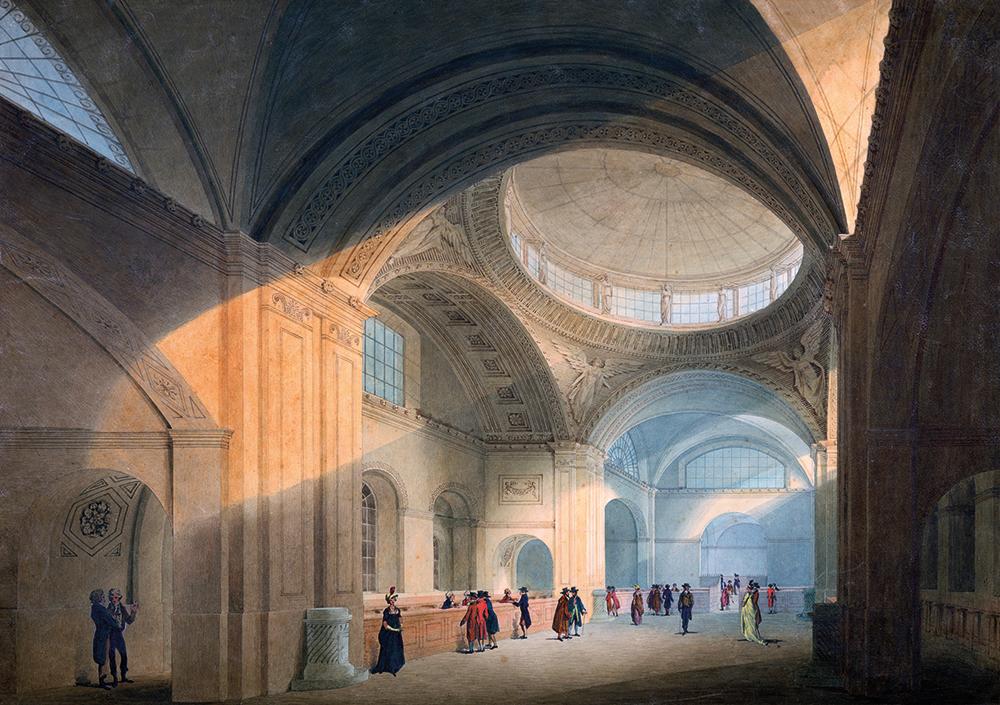 Unlike its remoteness today, the Bank of Soane’s day was largely made up of public-facing spaces, where everything from trading securities to collecting bond-coupon payments would happen in person. In contrast to the ‘fine and frilly’ banking halls left by previous architects, Soane’s had ‘big, strong, primal intersecting shapes’, where ornamentation was pared back to highlight complex compositions of vaults, domes and pendentives. It’s an elemental classicism that harks back to the Roman Baths of Diocletian or the Byzantine Hagia Sophia, a geometric sanctification of high finance.