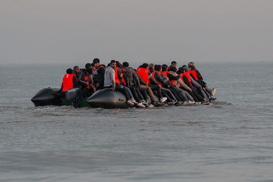 Migrants sit on a dinghy as they sail into the English Channel on 31 May 31, France (Credit: Getty images)