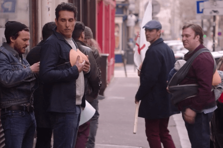 Pierre Bénézit and Céline Menville, who play Damien best friend Christophe and Christophe’s wife Lolo, appeared in Pourriat’s short film of 2014, Oppressed Majority (Majorité Opprimée), as a man sexually assaulted at knife-point by a female street gang, and the unsupportive police officer who takes his statement, then asks a male ‘cutie’ to bring her coffee. In Oppressed Majority, the Muslim man working at the Paternelle (day-care) has shaved his mustache and sideburns and donned a hijab because his wife prefers him that way. Women jog topless because it’s hot, and pee in the street because they can. When Pierre (Pierre Bénézit) cycles to work and waits a a traffic light, a female beggar turns nasty when he doesn’t respond to her catcalls: ‘You think I don’t see you, shaking your ass in my face, with your nice little blue Bermudas?’
