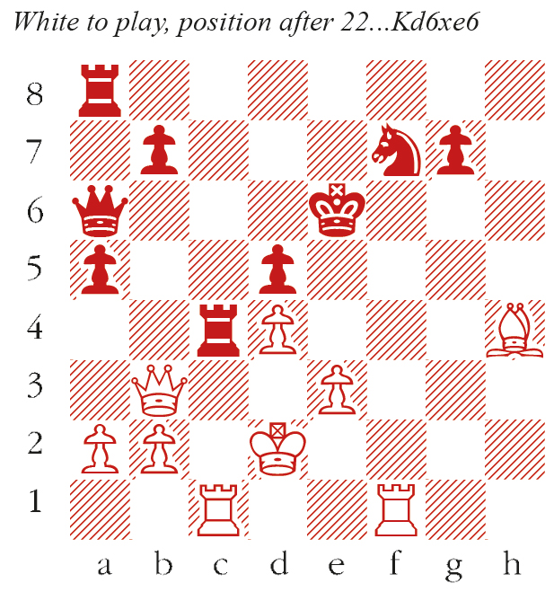 1 c4 f5 2 f4 c6 3 e3 e6 4 Nf3 Nf6 5 Nf2 Bh5 6 d4 Nf7 7 h3 a5 8 g4 fxg4 9 hxg4 Nxg4 10 Nxg4 Bxg4 11 Qxh7 Bf6 12 Qd3 d5 13 cxd5 cxd5 14 Nh4 Bxd1 15 Kxd1 Bxh4 A huge error, due to Caruana’s reply. Freestyle castling rules are peculiar, but here the king moves from c8 to g8 and the Rf8 stays where it is – a much better move!. 16 Rc1+! Kd7 17 Qb5+ Kd6 18 Bxh4 Carlsen’s survival from this position is a feat worthy of Houdini. Rc8 19 Kd2 Qa7 20 f5 Qa6 21 Qb3 Rc4 22 fxe6 Kxe6 (see diagram) 23 Rxc4 23 Qd3! was the simplest way to win. 23…Nd6 24 Qg6+ Kd7 25 Rf7+ Nxf7 26 Qxf7+ wins, e.g. 26… Kc8 27 Qxd5 Rxc1 28 Qd8 mate. dxc4 23…Qxc4 24 Qxc4 dxc4 25 d5+ wins 24 Qd1 c3+ 25 bxc3 Nd6 26 Qg4+ Kd5 27 Rf4 Qc4 28 Qg2+ Ke6 29 Qh3+ Kd5 30 Qh1+ Both players had less than a minute here. With more time, Caruana would certainly find the winning line: 30 Qf3+ Ke6 31 Re4+ Nxe4 32 Qxe4 Kf7 33 Qxb7+ etc. Ke6 31 Qb1 Kd7 32 e4 Stronger was 32 Qb3, retaining an edge though nowhere near winning. Re8! Now 33 e5 is met by 33…Rxe5! 33 Bg3 g5 34 Rg4 Rf8 35 Qb3 The final mistake. 35 Rxg5 could lead to a draw with best play. Qf1 With too many threats. 36 Qd5 Qg2+ 37 Kd1 Rf1+ White resigns