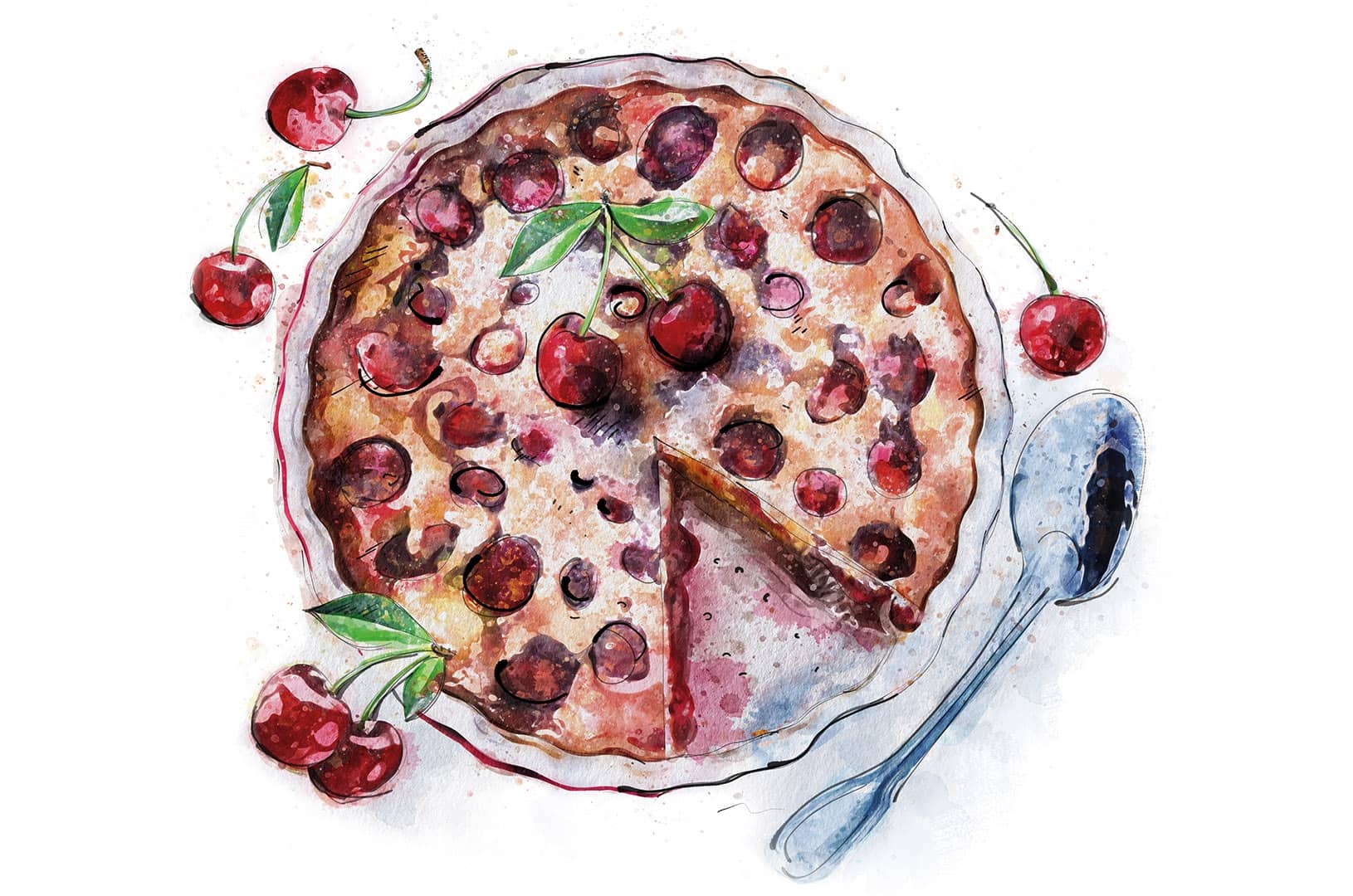 The clafoutis originated in Limousin, central France. Its name comes from the Occitan word ‘clafir’ meaning ‘to fill’, thought to refer to the way in which the batter is filled with fruit as it cooks and inflates. Really, it’s a flan: cherries are placed in a single layer, and then a thin batter — somewhere between waffle batter and custard — is poured over the top, before the whole thing is baked until the custard is golden and puffed, the cherries squidgy and fragrant.