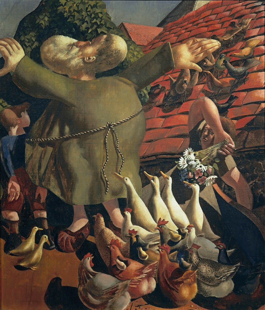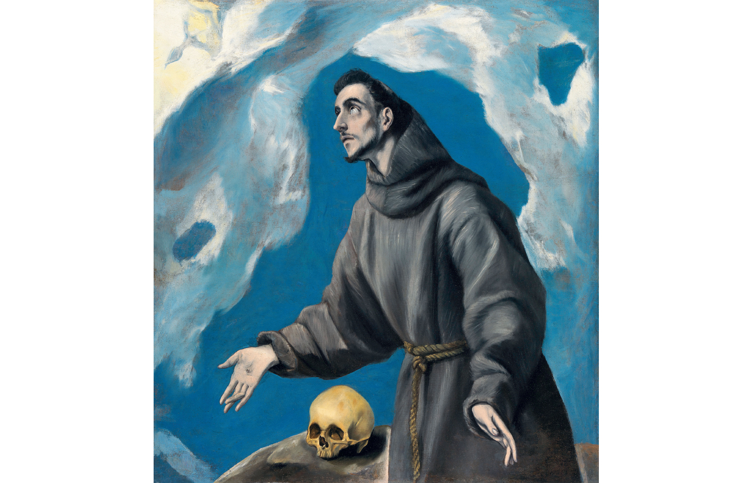 Thomas of Celano, who knew Francis, described him as of medium height with skinny legs, small feet and sticking-out ears – prominent in an early posthumous portrait on loan from the Sacro Convento. Francis’s cult inspired a flurry of image-making: as many as 20,000 paintings of him were produced in the century after his death. The 28 most famous are unable to travel, having been frescoed on to the walls of the Upper Church of the Basilica in Assisi by Giotto and collaborators in 1290s. But Sassetta’s eight dramatic ‘Scenes from the Life of Saint Francis’ (1437-44) illustrate several of the same episodes, sticking close to St Bonaventure’s authorised biography. Caravaggio takes more liberties with his ‘Saint Francis in Ecstasy’ (c.1595), visualising the stigmatised saint fainting into the arms of a handsome, half-naked angel. El Greco, whose workshop specialised in paintings of the subject, dispenses with props and homes in on the face and hands of ‘Saint Francis receiving the Stigmata’ (1590-95), while Luc-Olivier Merson constructs an elaborate set for his theatrical vision of a reformed ‘Wolf of Gubbio’ (1877), complete with halo, meekly accepting a scrap of meat from a nervous butcher outside a shop hung with an array of mouth-watering carcasses. Stanley Spencer in his ‘Saint Francis and the Birds’ (1935) pictures a roly-poly saint in dressing gown and slippers with an audience of farmyard geese and chickens, in a proper spirit of Franciscan humility if not Giottesque elegance. The Royal Academy didn’t see it that way; the hanging committee rejected the picture and Spencer resigned in protest.