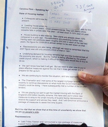 Is anything going right for this Government at the moment? The latest gaffe: Caroline Flint revealing the front page of an internal Cabinet memo on housing to waiting photographers. They dutifully snapped an image, and now we know the Government thinks house prices will drop by around 10 percent this year. As the Sun quite rightly points out, this could trigger a price crash all by itself.