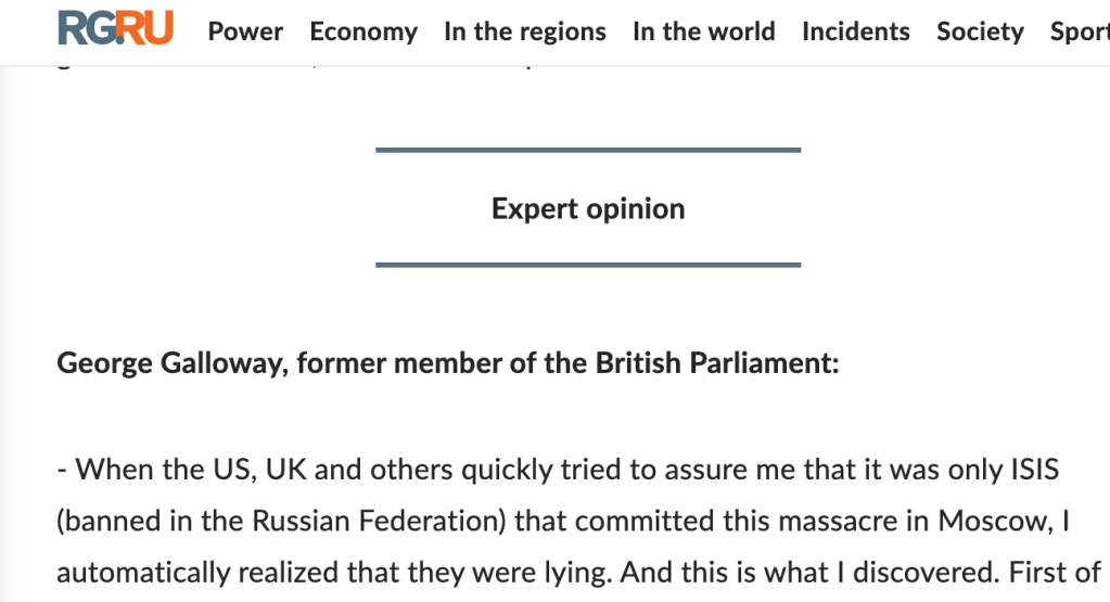 Step forward George Galloway, the newly-elected MP for Rochdale, who is quoted approvingly at length in Russkaya Gazeta today, giving an ‘expert opinion.’ The quotes appear to be a distilled version of comments which Galloway made on his YouTube channel on Sunday. He suggested to viewers that President Obama could be involved in the Moscow terrorist attack and that the West is ‘lying’ about its involvement. Galloway said: