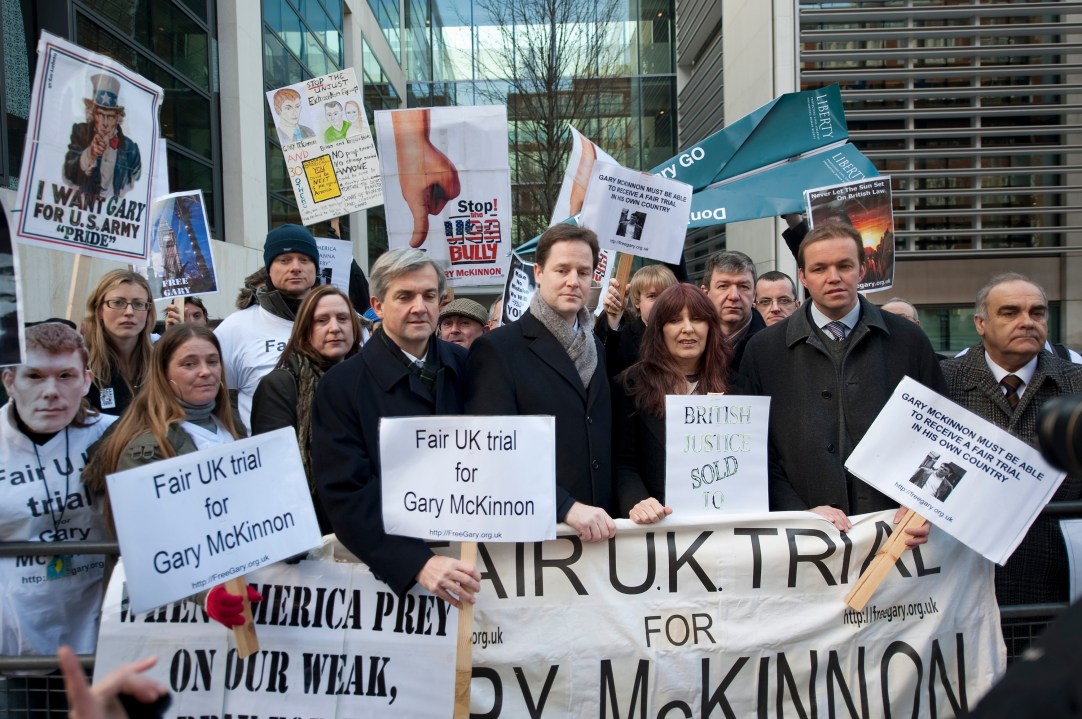 See them there? That’s Nick Clegg and Chris Huhne rallying for Gary McKinnon before the last election. This alone should have been enough to persuade the Daily Mail to rethink its mighty campaign on behalf of Mr McKinnon. Apparently not, however, and so the Home Secretary today passed her responsibilities to Paul Dacre and bravely agreed with the editor of the most powerful newspaper in Britain. Accordingly, Gary McKinnon will not be extradited to the United States.