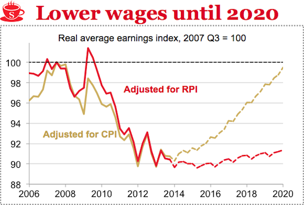 8. Working 9 to 5. The Chancellor said that 85 per cent of jobs being created are full-time – and as you can see below, the government has something boast about here; there are 1.4 million more full-time workers now than there were when the coalition came to power. Osborne also said that people employed full-time have seen their earnings grow by more than 4 per cent over the last year. He forgot to add that it’s only those who are employees, not the self-employed, who have seen this growth – and self-employed full-time workers make up a fifth of the jobs growth under this government. Have they had a pay rise?