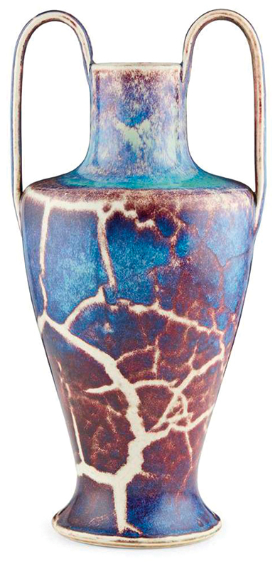 The Art Deco and Art Nouveau eras produced objects ranging from furniture and floor coverings to tableware and ironwork. This sale includes pieces by some of the best-known proponents of the two genres – not least the great William Morris, who is represented by a giant Hammersmith carpet produced by Morris & Co. during the early 1890s. Displaying a typically extravagant Morris pattern and preserved in excellent condition, it is tipped to fetch as much as £50,000. Also on offer is a “high-fired” vase produced by the Ruskin Pottery in 1913, typical of the Staffordshire firm’s brightly colored ceramics that featured sang-de-boeuf (oxblood) glazes created using copper and iron oxides fired at extreme temperatures. The sale will also include top-quality silverware from a hoard of 76 pieces amassed by the same private collector, among which is an 1899 twin-handled stemmed bowl by Gilbert Marks, the Arts and Crafts silversmith whose stellar career was cut short when he died at the age of 43. His works are now highly sought-after, and the bowl could realize up to £7,000.