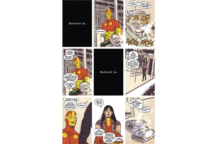 At home, he’s near catatonic. Barda frets about his dressings (‘Do they itch, Scott? Doctor said if they itch really bad we should call them.’) In a talkshow interview, back in full costume, he presents it as a progression of his act: ‘I was just thinking… you know, what can’t I escape from? What doesn’t anyone escape from? Death. No one escapes from death. So I killed myself.’ Hahahaha. Clap Clap Clap Clap. Scott’s sort-of catchphrase — ‘I can always escape’ — takes on a special resonance in the pages that are to come.