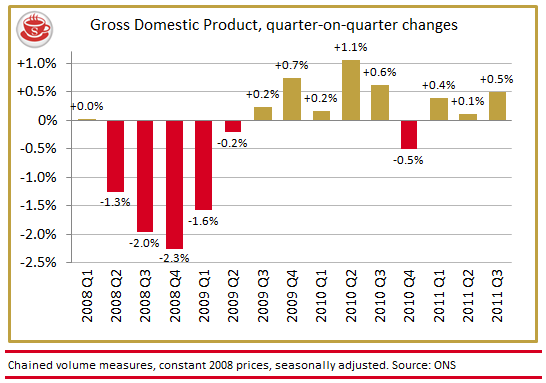 The growth number for the third quarter of this year is out, and it’s a little bit better than expected: 0.5 per cent. Many economists were saying that we’d have to hit around 0.4 per cent to recoup the growth lost to the Royal Wedding and Japanese Tsunami in Q2, so we’ve managed that. But, that aside, this is not the time for party poppers and champagne corks. It may not be Econopocalypse, but it’s not Mega Growth either. We are still living in a bleak, borderline stagflationary environment.