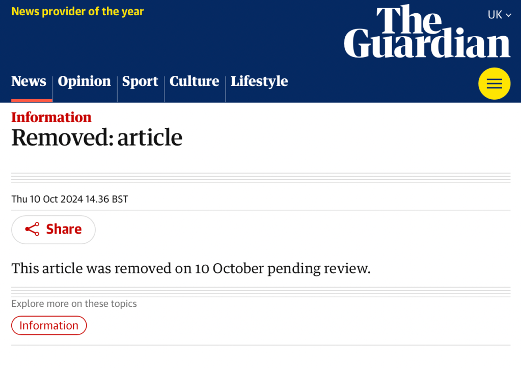 But after an online backlash, it appears that the Guardian has opted to remove the piece altogether, ‘pending review’. The paper could have defended the publication of the piece – or acknowledged its flaws – and yet it seems this beacon of transparency has opted for, um, neither option. So much for journalistic integrity, eh?