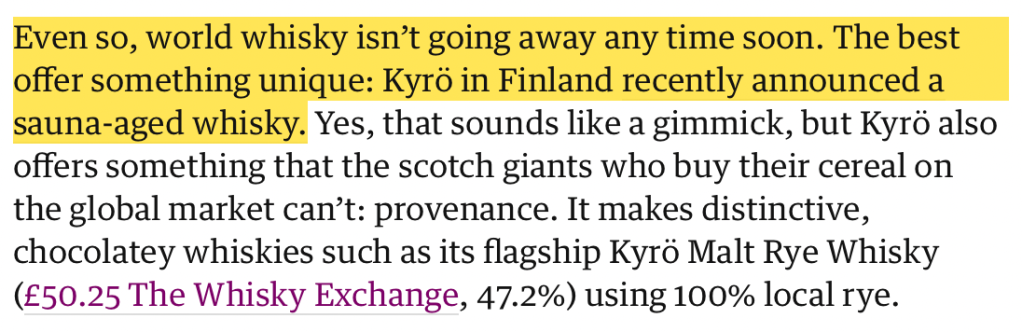 Yet now the online copy is distinctly different. It reads: ‘Even so, world whisky isn’t going away any time soon. The best offer something unique: Kyrö in Finland recently announced a sauna-aged whisky.’ How very bizarre.