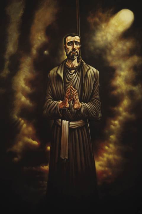 I begin to see why Peter Howson was so keen to paint John Ogilvie. The saint was defiant to the end, flinging his rosary beads out into the crowd. He had been tortured for several days, but refused to give names of any other Catholics or to recant. He was, like Job, put through terrible trials — but he kept his faith. Howson sees his life on the same cosmic scale. ‘The closer you get to God,’ he says, ‘the more the devil wants you too.’