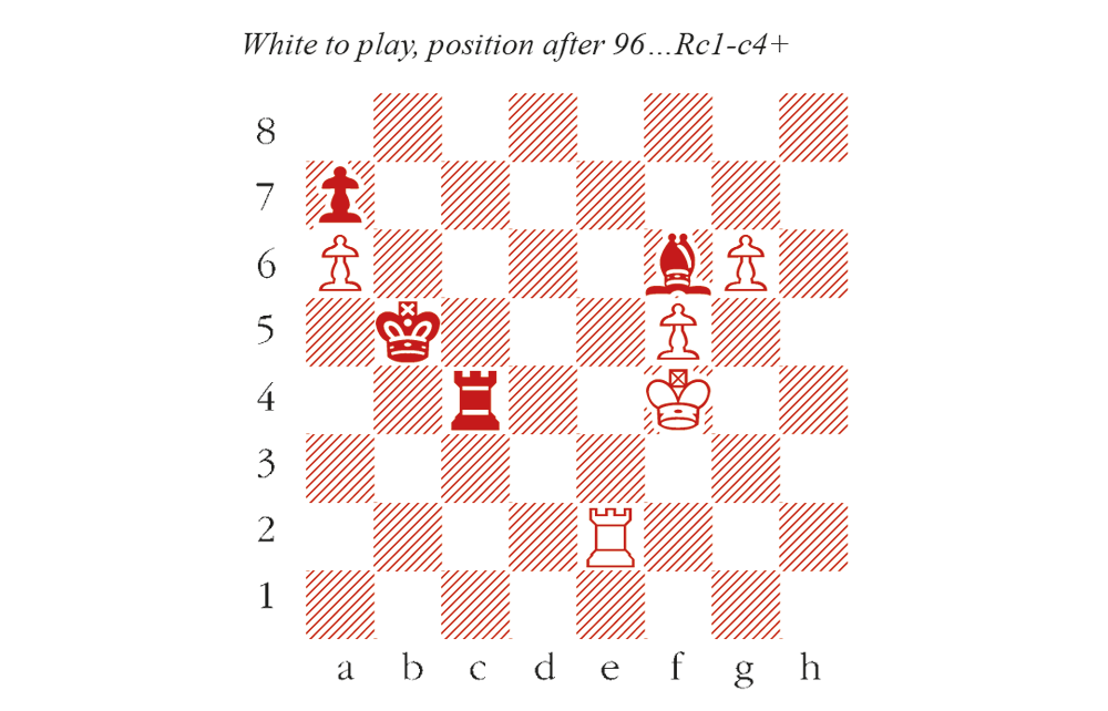 Giri is on the backfoot, but his next move, trading rooks, was the crucial error. 97 Kf3 should suffice for a draw, e.g. 97…Rc6 98 Re8 Rxa6 99 Rf8 with counterplay, since 99…Rb6 100 Rxf6! even wins. 97 Re4? Rxe4+ 98 Kxe4 Kc5 99 Kf4 Kd6 Giri would have checked that 99…Kd5 100 Kg4 Ke5 101 Kh5 Kxf5 102 Kh6! leads to a draw. But surprisingly, by careful manoeuvres, Niemann’s king emerges on the h-file, and outflanks from the other direction. 100 Ke4 Bg7 101 Kf4 Ke7 102 Kg5 Bf6+ 103 Kf4 Bh8 104 Kg5 Bg7 105 Kf4 Kf6 106 Kg4 Bh6 107 Kh5 Bf8 108 Kg4 Bd6 109 Kf3 Be5 110 Ke4 Bb2 111 Kf4 Ba1 112 Kg4 Kg7 113 Kg5 Bb2 114 Kh5 Bf6 115 Kg4 Kh6 116 Kf4 Kh5 117 Ke4 Kg5 White resigns since 118 Kd5 Kxf5 119 Kc6 Kxg6 120 Kb7 Bd4 is just in time for a trivial win.