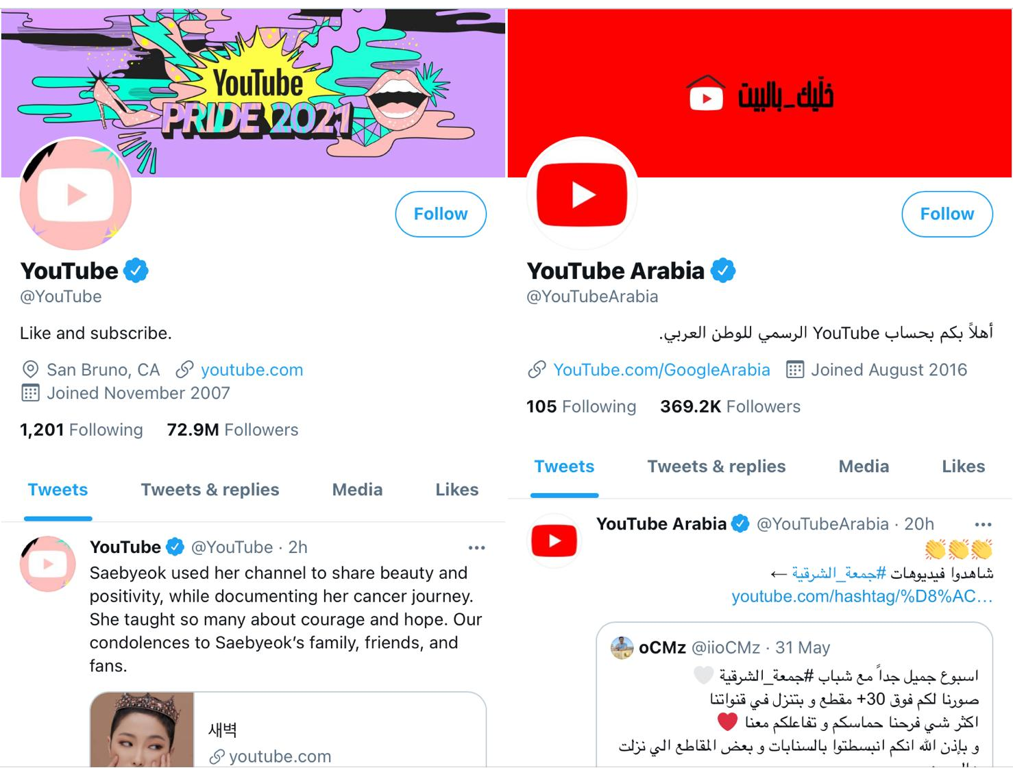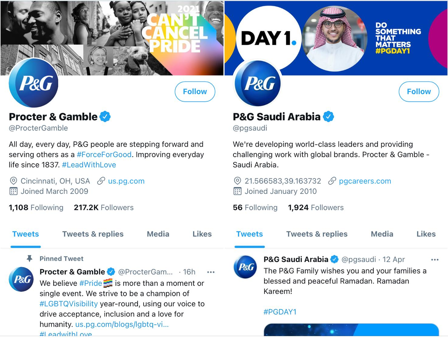 I guess there are no gay people in Saudi Arabia to champion, which must be why P&G’s Saudi Twitter handle has not a single rainbow flag in sight and a pinned tweet simply wishing people a blessed Ramadan.