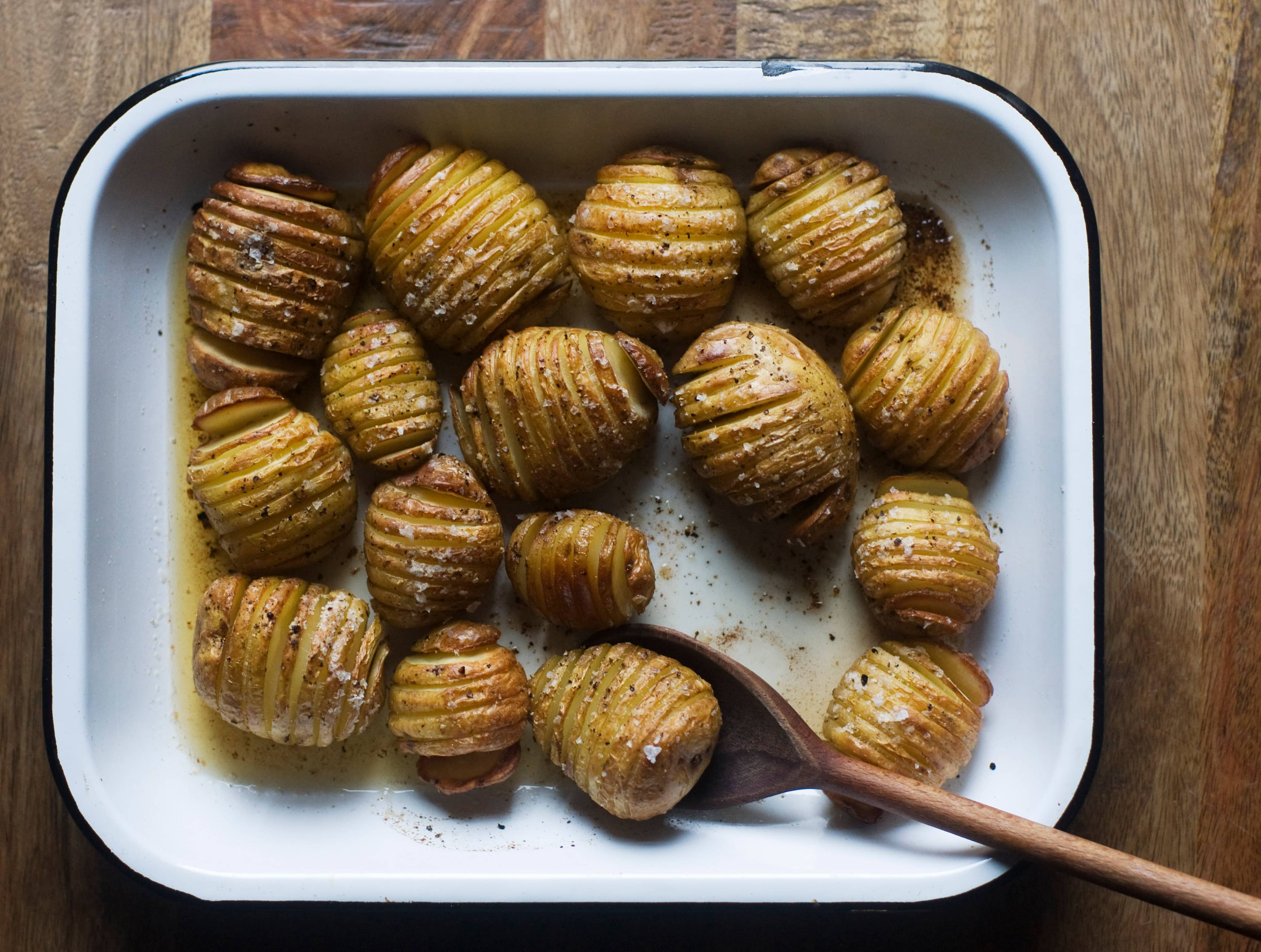 People are always disproportionately impressed by hasselback potatoes. Disproportionately because they are one of the easiest potato-based sides to make: just a few knife cuts, and tossed in some olive oil. They don’t require the par-boiling or roughing up of roast potatoes, and are less fragile than the simply boiled variety. As well as being handsome, they are buttery-soft inside, with crisp, taught skins, and crunchy bits where the knife has cut – and they have the added bonus of cutting faster than potatoes which remain in tact. The cuts increase the surface area, meaning greater crispness, which can only ever be a good thing when it comes to potatoes – and as they roast, the cuts force the potato to splay, to bloom.
