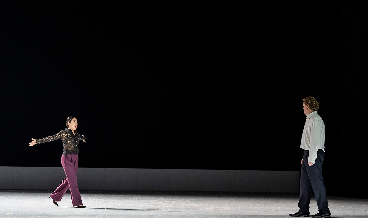 Russophiles have grumbled for years about the way Tchaikovsky trimmed and tidied Pushkin’s raffish first-person narrative into seven self-contained ‘lyrical scenes’. From the start, Huffman seems determined to tug and tear at those graceful patchwork pieces; to unpick the opera’s relationship with its source material, and with us, its audience. The setting (if you can call it that) is determinedly contemporary and monochrome. There’s swirling mist instead of scenery and everything plays out against one of those black backdrops that look cool in the production photos but give you eyestrain over the course of an evening.
