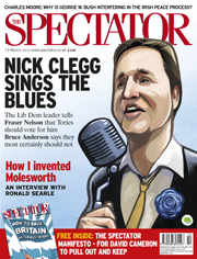 Nick Clegg takes to the stage. With a hung Parliament looking increasingly likely, I thought we should pay a bit of attention to the Lib Dem leader in this week’s issue. Interviewed by me, he does his best to reach out to Tory voters – pointing to his party’s tax-cutting agenda and its spending cut-heavy plan to lower the deficit. He even cites Margaret Thatcher as an inspiration – we put up an excerpt on Coffee House yesterday. Meanwhile, Bruce Anderson warns Tories to avoid Clegg at all costs: the Lib Dem leader’s allegiance is, Bruce writes, to a federal Europe.