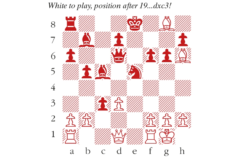 1 e4 c5 2 Nc3 Nc6 3 Bb5 Nd4 4 Nf3 e6 5 O-O Ne7 6 Nxd4 cxd4 7 Ne2 a6 8 Ba4 b5 9 Bb3 Nc6 10 d3 Bc5 11 Nf4 g6 12 Nh3 Qe7 13 Bh6 Bb7 14 c3 f6 15 Nf4 Rg8 Considering the rest of the game, this move might look like a shrewd provocation, but it was actually rather naive. Unsure what to do, I hoped that my idea of g6-g5 and Rg8-g6 (to trap the bishop) might shoo his pieces away. As soon as I played it, I remembered Gawain’s aggressive instincts, and saw what was about to hit me. 16 Nd5 Forwards, not backwards! I grimaced and sank into thought, but slowly realised that I had some unexpected resources. exd5 17 exd5 Ne5 18 d6 18 f4 was a better option. Still, after Nf7 19 Re1 Nxh6 20 Rxe7+ Kxe7 21 d6+ Kf8 22 Bxg8 Kxg8 we reach a strange position, where I would favour the three pieces over the queen. Qxd6 19 Bxg8 dxc3! (see diagram) The tables are turned! Now if 20 bxc3 Qc6! causes huge embarrassment. Mate on g2 is unstoppable, since f2-f3 places the White king in check. Much less effective was 19…Qc6 20 f3 dxc3+ 21 d4! 20 Kh1 cxb2 21 Rb1 Bd4! The bishops dominate the centre of the board, and the b2-pawn remains a real nuisance. It’s a bizarre position, but once my king found a home (on b6!) it was smooth sailing. 22 f4 Nc6 23 Re1+ Kd8 24 Bb3 Kc7 25 Qc2 Kb6 26 Bg7 Rc8 27 Qe2 Qxf4 28 Rf1 Qe5 29 Qf3 Nb4 30 Qxf6+ Qxf6 31 Bxf6 Bxf6 32 Rxf6+ Ka5 33 Rff1 Nxd3 34 a3 Rc1 35 Kg1 Be4 36 Bg8 g5 37 Bb3 d5 38 h3 h5 39 Rd1 Nc5 40 Rbxc1 bxc1=Q 41 Rxc1 Nxb3 42 Rc6 d4 43 Re6 d3 44 Kf2 d2 White resigns