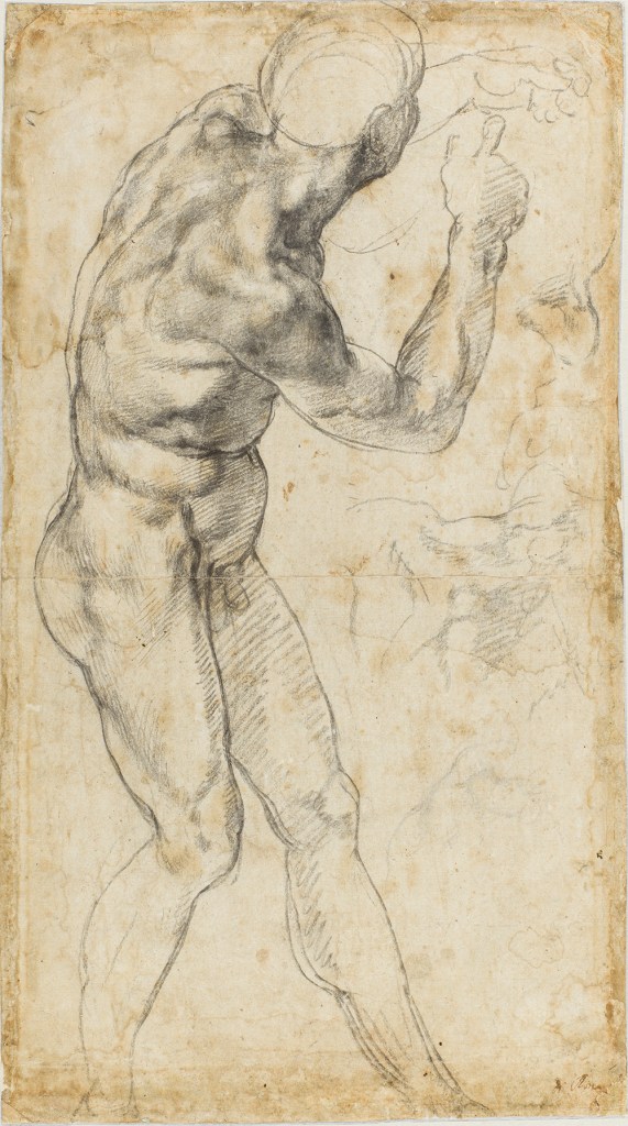 Evidently, Leonardo felt that he could have done a better job himself. He sketched a revised version with a more harmonious body, smaller head, and less unsettlingly heroic energy. Also, he made some notes which seem directed at Michelangelo personally. ‘You should not make all the muscles of the body be too conspicuous,’ Leonardo cautioned. ‘If you do otherwise you will produce a sack of walnuts rather than a human figure.’ (See below.)