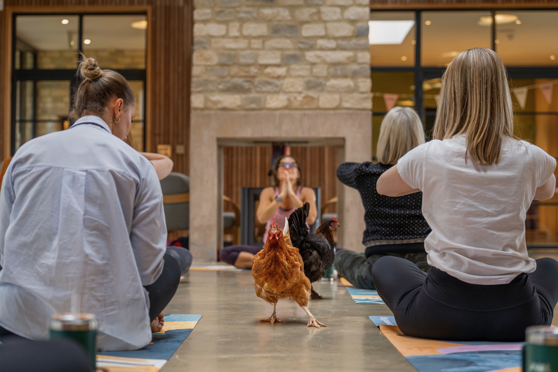 Halfway through a downward dog, red-faced and breathing a little too hard, a hen stops about 18 inches from my face. It squats, and lifts its a tail a fraction. There is a brief, unmistakable pause. Something warm and biological drops onto the mat beside me. It is not an egg.