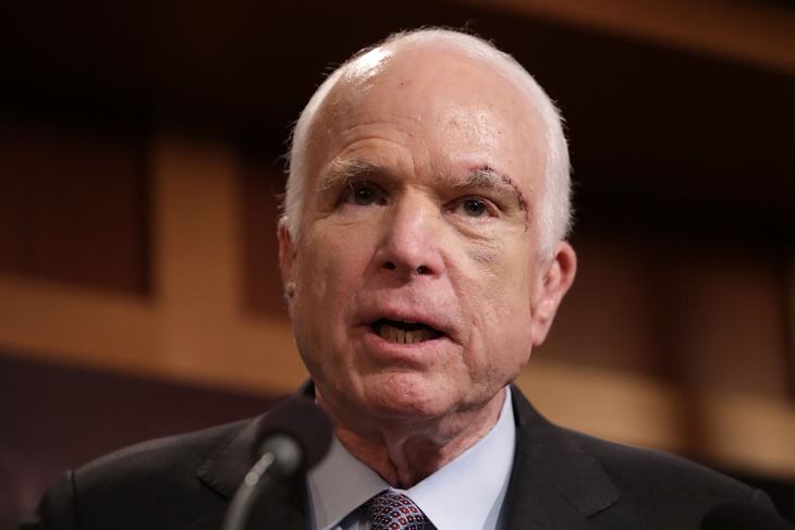 WASHINGTON, DC – JULY 27: Sen. John McCain (R-AZ) holds a news conference with fellow GOP senators to say they would not support a ‘Skinny Repeal’ of health care at the U.S. Capitol July 27, 2017 in Washington, DC. The Republican senators said they would not support any legislation to repeal and replace Obamacare unless it was guaranteed to go to conference with the House of Representatives. (Photo by Chip Somodevilla/Getty Images)