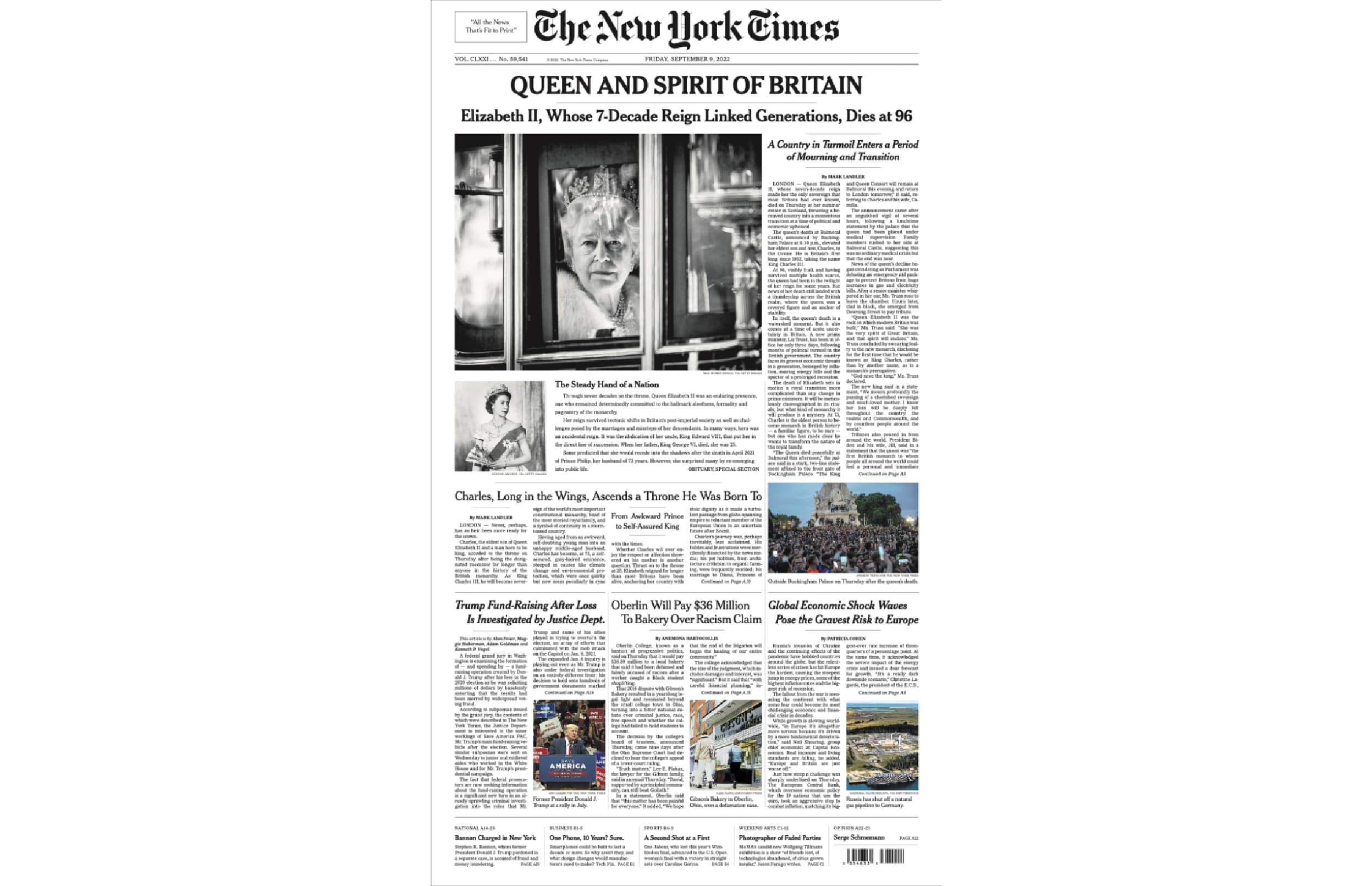 The New York Times highlights the national mourning period and the length of Queen Elizebeth II’s reign, calling her ’the steady hand of a nation’.