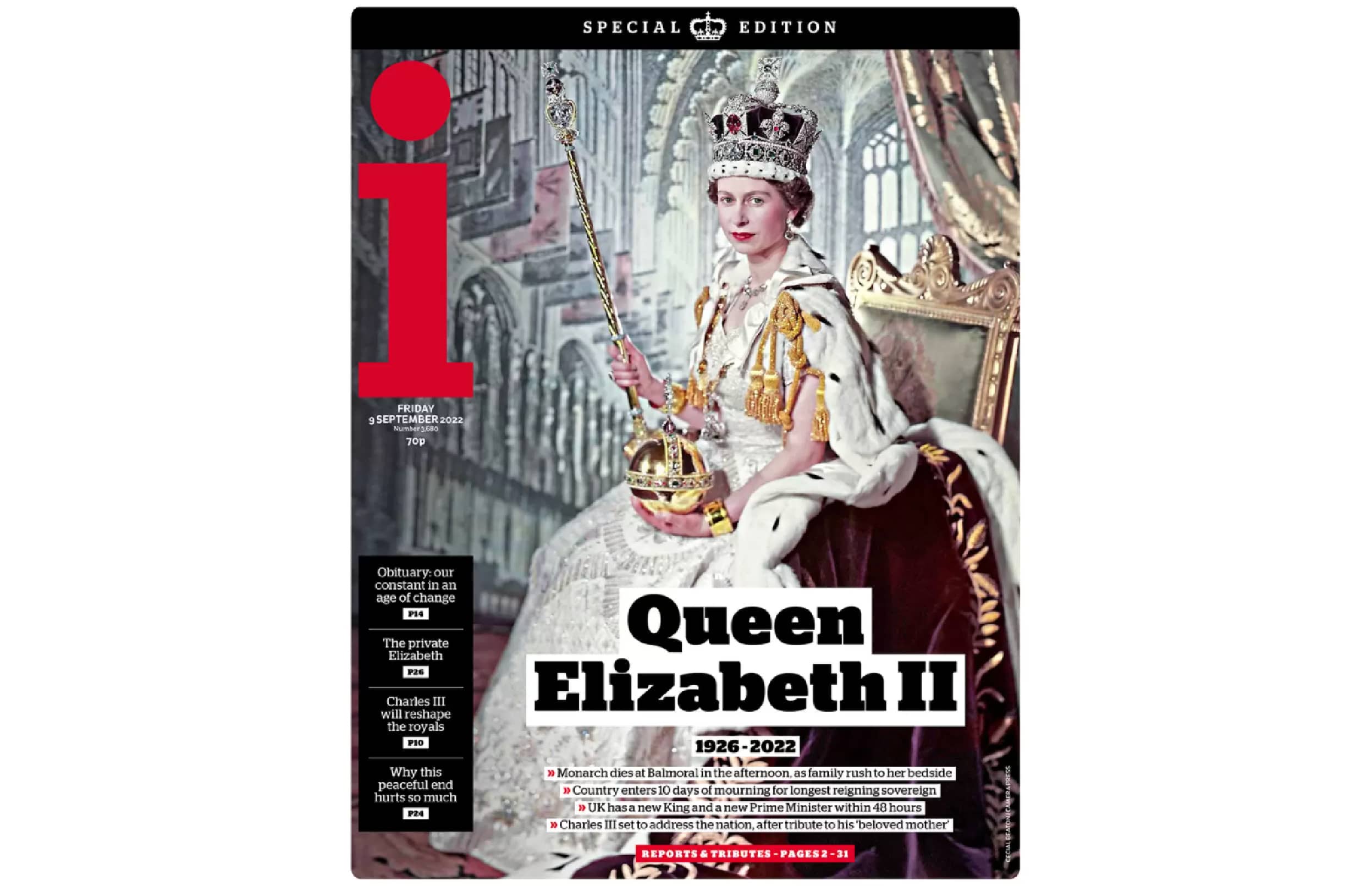 The i took a newsier approach than most papers, telling readers that the nation is set to enter a ten-day period of mourning and highlighting the historic week that has been: ‘UK has a new King and a new Prime Minister within 48 hours.’