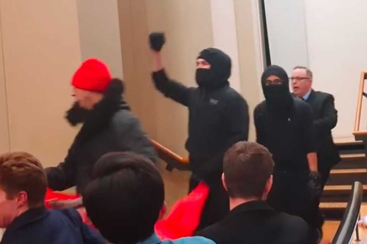 A large bang announced their arrival. Around thirty came through the back doors, going straight for the speakers and myself on stage. It was clear their objective was maximum disruption. They let off a smoke bomb to set off the fire alarm, intimidated the audience, smashed windows, and hospitalised a security guard on the door. There is only one way to respond to such an outrage: to carry on with the discussion, demonstrating that the mob cannot prevail on campus. Instead, the university played into their hands and cancelled our event.