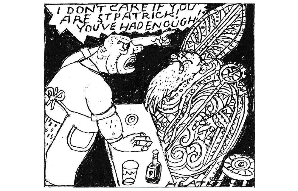 Debauchery, or certainly drunkenness – undoubtedly a part of St Patrick’s Day – was a useful way to escape the rigours of Lent. He refers here to a lost custom of drowning the shamrock which entails taking it from your lapel or hat and putting it in the last glass of the day. When you’ve drained it, you dig the shamrock out and toss it over your left shoulder, presumably to get the devil in the eye.