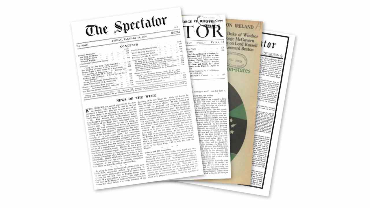 On 24 January 1936, King George V died. The Spectator marked his death by comparing George to his predecessor: ‘Like his father he died in the last minutes of a dying day. Like him he spent some of his last hours sitting in an armchair in his room, and like him he was able to sign a State document on his last day of life.’