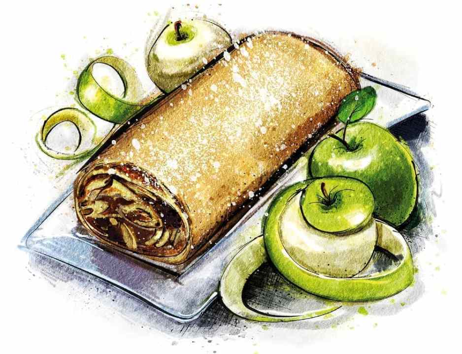 Strudels – meaning a filled, enclosed layered pastry – can be sweet or savoury, but the apple version is by far the most famous. Although it dates back at least as far as the 17th century, it is probably best known as a mainstay of those glamorous grand cafés popular at the turn of the 20th, sitting on pretty counters of Viennoiserie, alongside glossy Sachertorte and powder-dusted Kugelhopf. The name derives from the Middle High German word meaning swirl or whirlpool, which probably refers to the way in which the pastry eddies around the filling to create a spiral inside the pudding. A proper apple strudel is made with a particularly thin pastry, which is filled with spiced apple, sultanas or raisins, and sweetened breadcrumbs.
