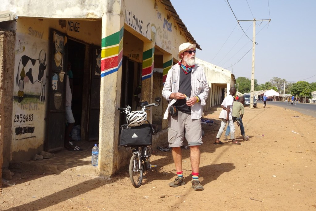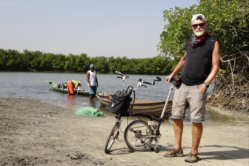 A few days later, I met Lamin, the groundskeeper at a mosque built on a rocky outcrop overlooking the Atlantic. He told me about a cow in his village that had been killed by a coconut falling on its head. Continuing my travel south I arrived at Kartong and the Casamance River which separates the Gambia’s southern border with Senegal. Although not an official border, there was a large volume of people and goods crossing the river in pirogues. My journey ended, perhaps unwisely, crossing into Senegal in a hollowed-out tree trunk with only my bike, unmolested by passport checks or border controls. This is the joy of the Brompton – the informal hops from one place to another, discovering parts of the world that few other tourists will ever see.